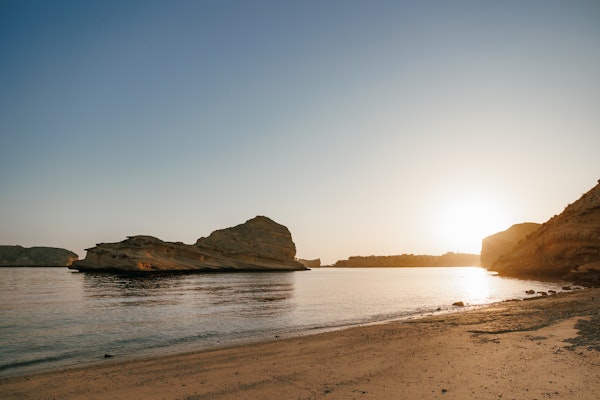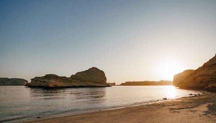 At The St. Regis Al Mouj Muscat Resort, the beach stretches along the coastline with wide views across the Gulf of Oman. Early mornings here feel calm and spacious, with soft light across the water.